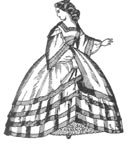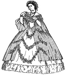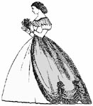 101-L Beauty ~ Draped Ball Gown, c. 1859 Reproduced from Godey's Ladies' Book. True period version of gown worn in production of Beauty and the Beast. Bottom of skirt formed of many flounces. Low corsage bodice with short sleeves. Over skirt is drawn up in large flounces and held in place by bows and ribbons. Incl. sizes 6-16. Skill Level 3+ $36 + $9 S&H 101-XL Generous Beauty |