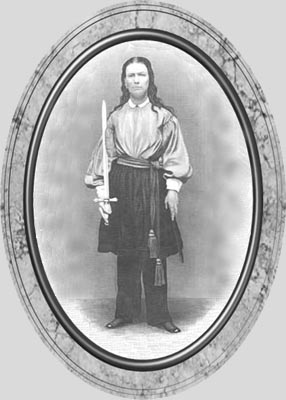 Original Engraving of Kady Brownell in Vivandiere Uniform, 1866. Kady fought with her husband during the war (this photo would have been taken after the war), and legend has it, when her husband, who carried the flag, fell, Kady picked up the flag and carried on proudly.