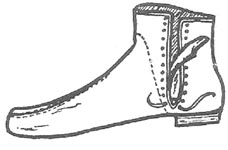 ![]() ![]() ![]() 90-91-92-L Boots, Glengarry Hat & Gaiters Boots pattern adapted from Costume in Detail. Blue cloth boots, laced on inside, leather 5/8" heel. Tongue lined with pink silk, boot lined with white cotton. Original made in Oxford. Glengarry hat pattern adapted from Frank Leslie’s. Originals in TCS Collection. Featured hats from Genin’s Bazaar, Aug. 1863. Trimmed with plaid ribbon. Gaiters adapted from originals of dark boxcloth (a very tight, brushed wool) that looks like thick felt. Worn over shoes to protect them. Top edge is rolled with leather piping. Leather strap beneath.